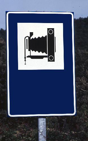 Die typische Seitenansicht einer Balgenkamera (hier eine Patent Etui der Dresdner Kamerawerkstätten). Dieses Kameraprofil ist stilbildend für Kamerasymbole auf Hinweisschildern (Photo von Stefan Nützel) weltweit geworden.