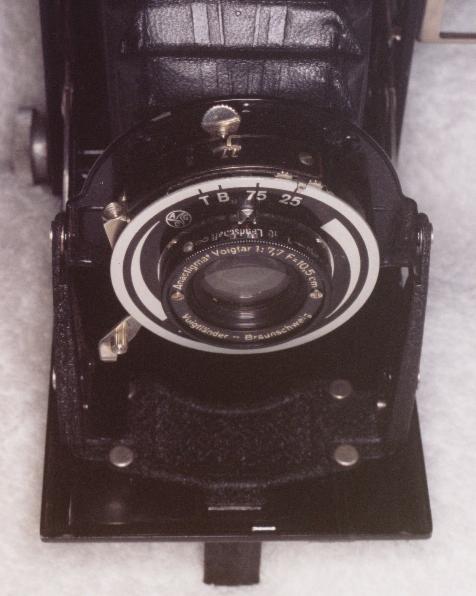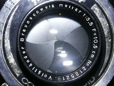 Dreilinsiges Objektiv von Voigtländer. Oft nicht besonders lichtstark; das abgebildete Beispiel hat die Lichtstärke 1:7,7 bei einer Brennweite von F=10,5cm.