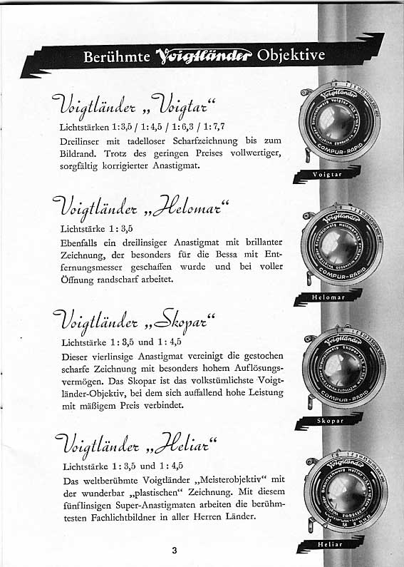 Spitzenobjektiv der Voigtländer-Bessa-Reihe; Fünflinser mit außenstehenden, verkitteten Linsenpaaren, dem Heliar ähnlich.