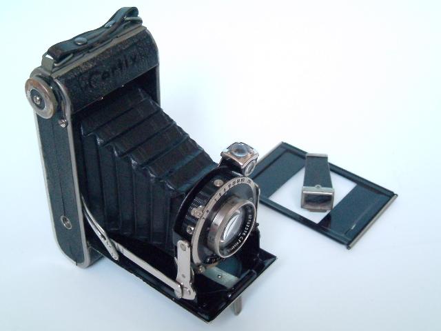 Kamera für die Formate 6x9 und 6x4,5 (mit Einlegemaske); Unvergütetes Objektiv Corygon Anastigmat F 3,8 10,5cm von C. Friedrich, München. Compur-Verschluß. Deutsche Blendenreihe. Ausführliche Schärfentiefentabelle auf der Rückseite. Das Bild zeigt neben der Kamera auch die Einlegemaske und einen Aufsetzsucher.