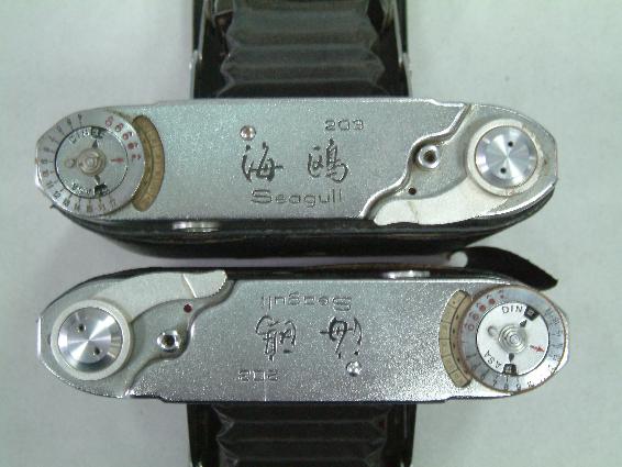 Seagull 203, eine chinesische Nachahmung der Agfa Super Isolette, ähnlich der Hongmei . Im Gegensatz zur Hongmei hat die Seagull (chin. hai'ou) allerdings einen gekuppelten Entfernungsmesser. Das abgebildete Modell hat ein Objektiv S-111-2 3.5/75 in einem Verschluß mit (fast) internationaler Zeitenreihe: B 1 2 4 8 15 30 60 125 300.