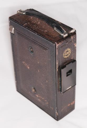 6x9, mit Agfa Anastigmat Igestar F:7,7, ohne Brennweitenangabe. Der Verschluß ist sehr einfach und bietet selbstspannend nur die Zeiten 1/100, 1/50, 1/25 und B. Drei Blendenstufen sind einstellbar: 16, 11 und 7,7. Die Entfernung ist in zwei Zonen einstellbar: oo bis 5m sowie 5 bis 2m. Wenn die Kamera (gegen Federspannung) in die Nahstellung gebracht wird, springt sie beim Schließen des Deckels selbsttätig in die Ferneinstellung zurück.