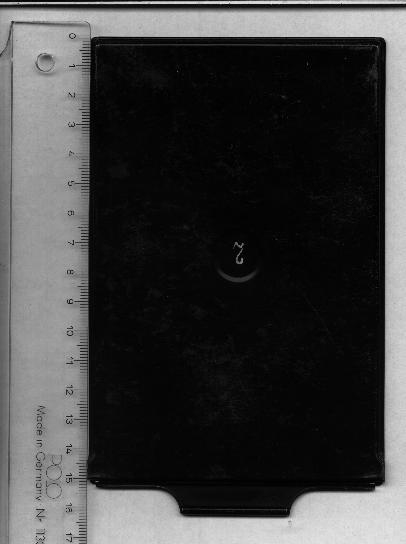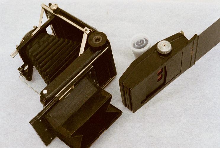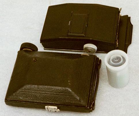 Die Patent-Etui aufgeklappt. Auf der Rückseite halb aufgeschoben ist die Mattscheibe für die Scharfeinstellung, daneben liegt das Rollfilmmagazin. Die Dose eines Kleinbildfilms dient zum Größenvergleich.