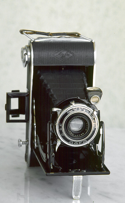 6x9, mit Agfa Anastigmat 4,5/10,5cm, Sportsucher und Laufbodenmechanik; mechanisch schönes Gerät, das leider enttäuschende Bilder macht. Die Laufbodenmechanik ist bauhistorisch ein Überbleibsel der gleichnamigen Baureihe von Agfa für Planfilm- bzw. Plattenkameras. Das gezeigte Modell wurde in Berlin auf dem Flohmarkt für 19 Euro gefunden.