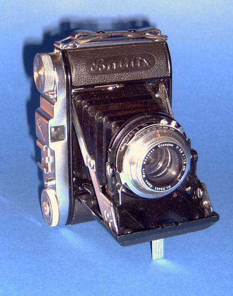 Produziert zwischen 1950 und 1955 im Balda-Werk Bünde, West-Deutschland. Klappkamera für 120-er Rollfilm, 12 Aufnahmen 6x6.